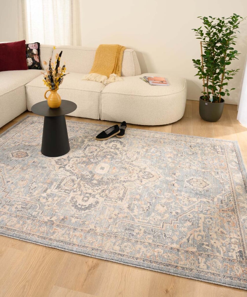 Le bleu clair apporte une sensation de fraîcheur sans étouffer le sol, ce qui est parfait pour se détendre pieds nus le matin avec son café. Dans ce genre de configuration, le tapis ne doit pas recouvrir l’intégralité du revêtement.
